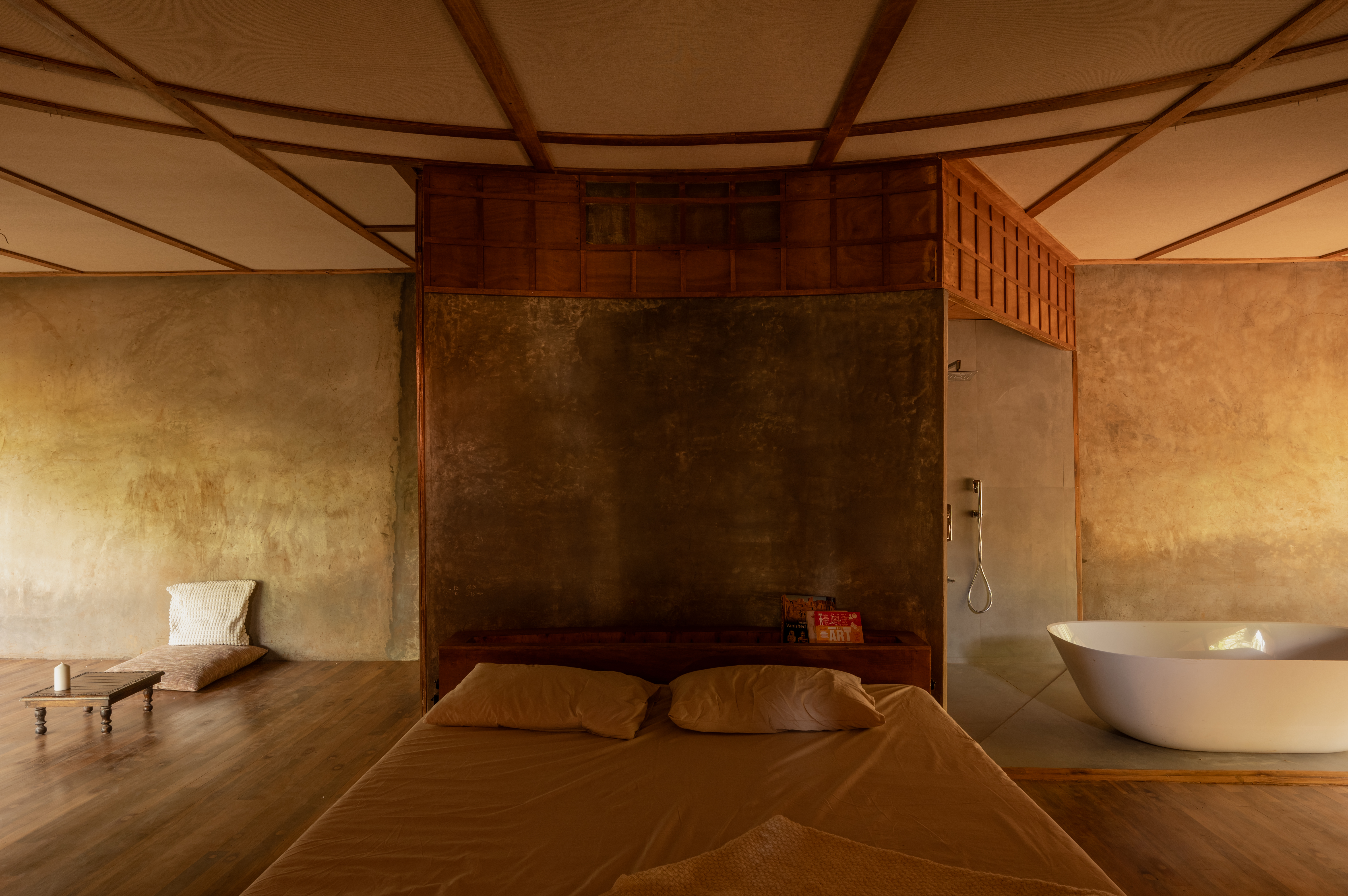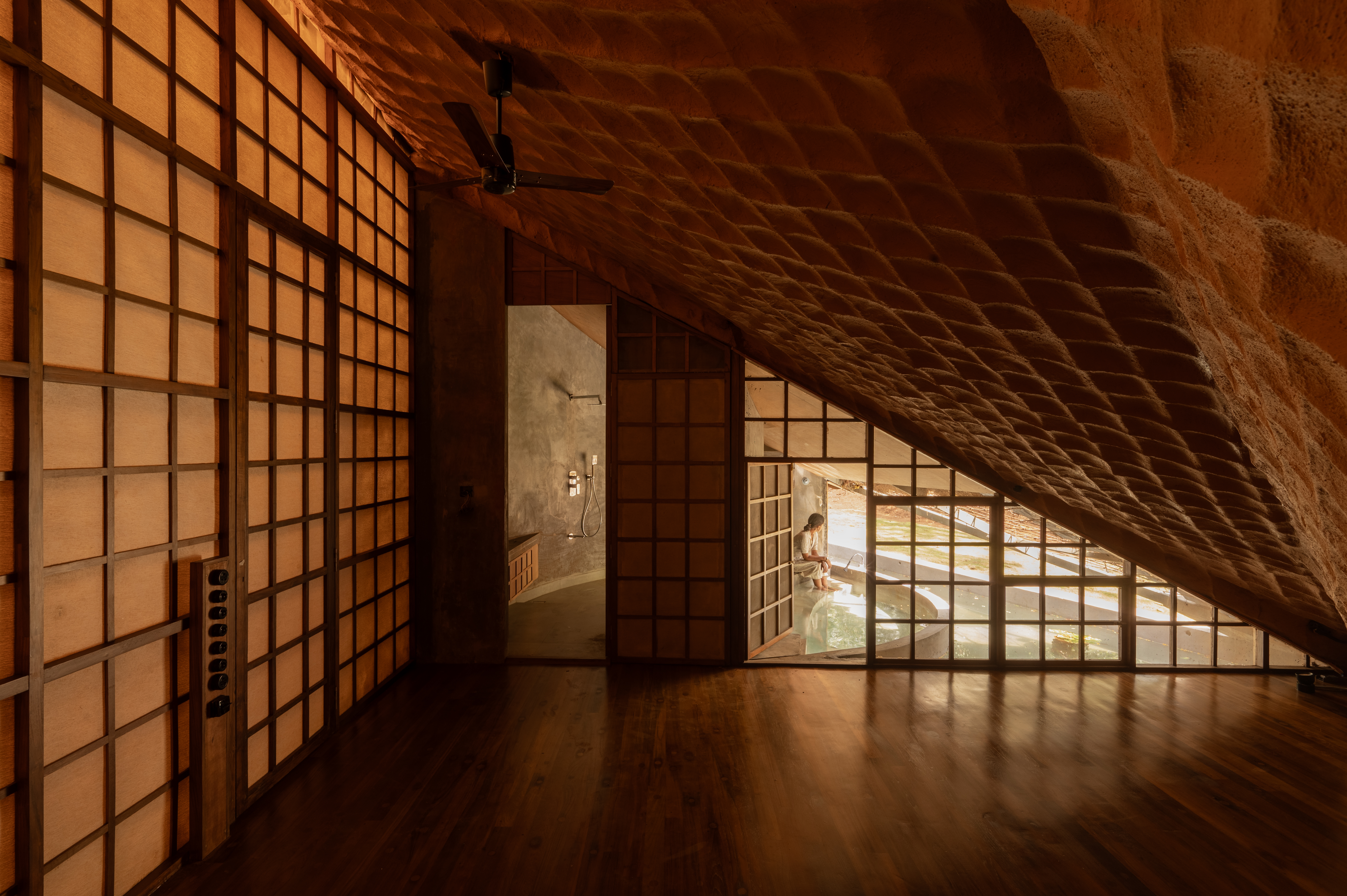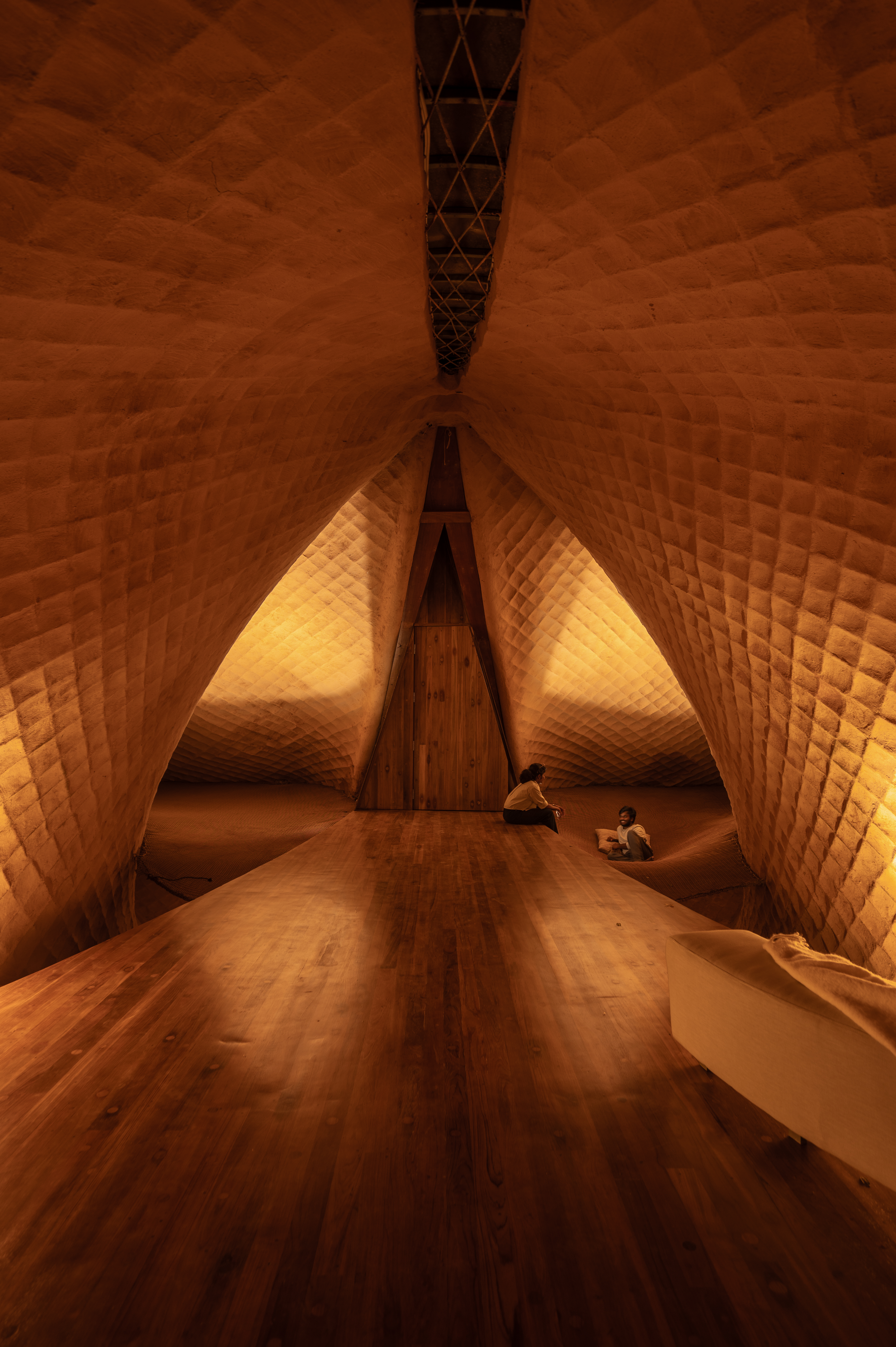 The land is split by a hundred-foot spillway where foundations are prohibited and machinery requires uninterrupted access. Transporting standard materials to the location is difficult and inconsistent. These factors pushed the studio toward a structural format that could work with minimal intervention. The result is a habitable suspension bridge built on four footings and shaped through four hyperbolic parabolas using steel tendons combined with a mud-thatch composite.