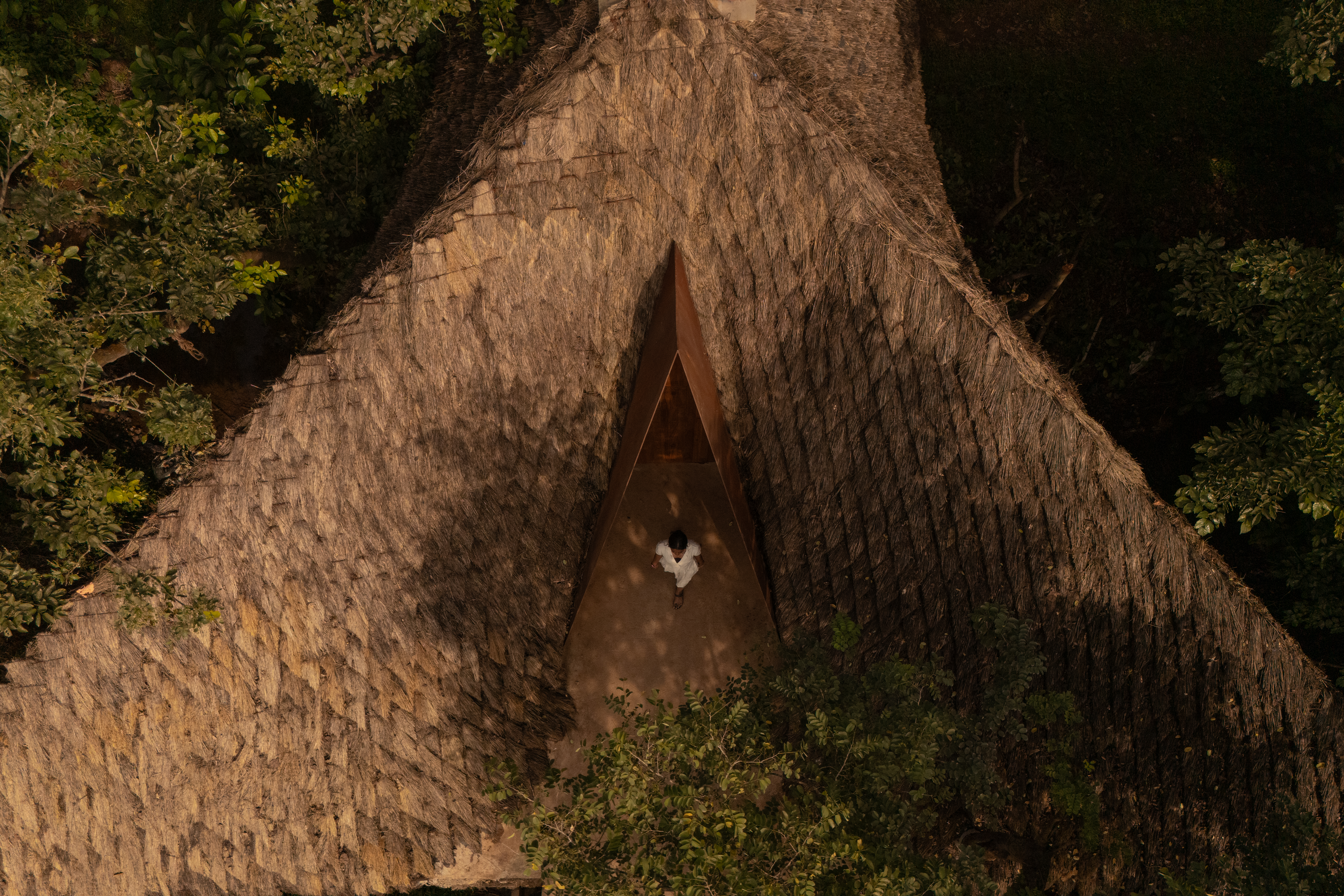 The structure sits inside the gorge with an intentional restraint. Its form does not overpower the landscape and instead aligns with the density of the vegetation. The thatched exterior, informed by the armour-like texture of a pangolin, delivers insulation and helps the house blend with its surroundings. The mud plaster strengthens the shell, prevents pest intrusion, and supports the bridge without the need for a vertical suspension pillar.