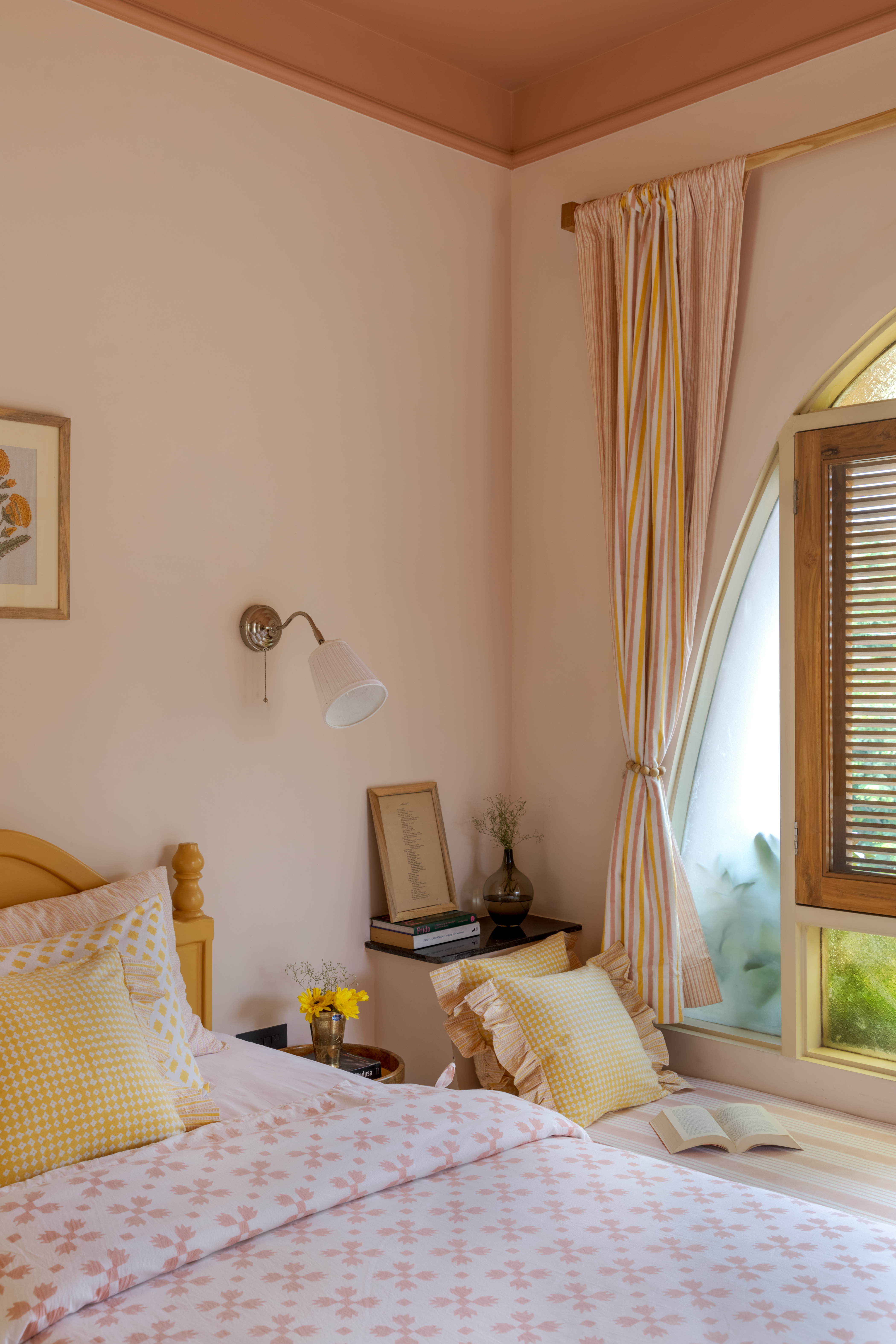 There are four rooms, each in a distinct palette: blue-red, yellow-apricot, sage green-ivory, and pink-white. All have ensuite bathrooms, reading nooks, air-conditioning, and block-printed linens by Rathore herself. The family room fits both bunk beds and a double bed, perfect for parents with kids. Two rooms open to small balconies ideal for morning chai. The façade carries five centenary arches, a nod to Rajasthani heritage buildings, and a spiral staircase leads to the first-floor living area.